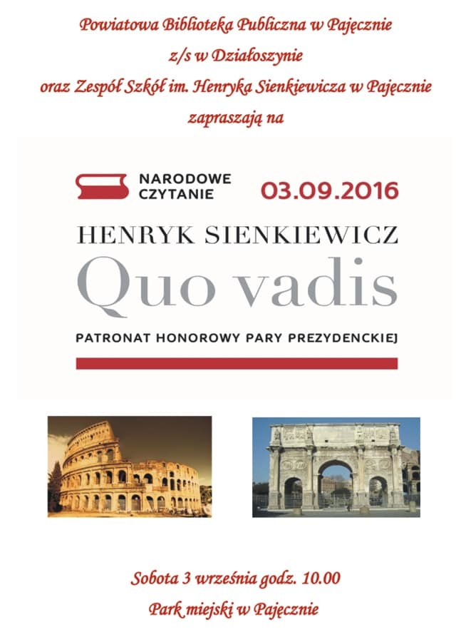 Narodowe Czytanie w Pajęcznie ipp 1 września 2016 Zapraszamy w sobotę, 3 września, na czytanie dzieła naszego noblisty. Szczegóły na plakacie.