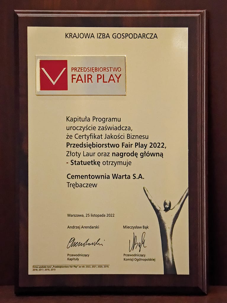 Certyfikat Przedsiębiorstwo Fair Play jest potwierdzeniem rzetelności i transparentności działań Cementowni Warta S.A., przejawiających się nie tylko w prowadzeniu biznesu, ale również w działalności prospołecznej i charytatywnej. Jest to wyjątkowe wyróżnienie poparte rzetelnym i wieloetapowym procesem weryfikacji. Staramy się być stabilnym partnerem biznesowym oraz społecznym. Cieszymy się, że w tych trudnych czasach nasz dorobek w tym zakresie jest oceniany pozytywnie. – powiedział Dariusz Gawlak Prezes Zarządu/Dyrektor Naczelny Cementowni Warta S.A.