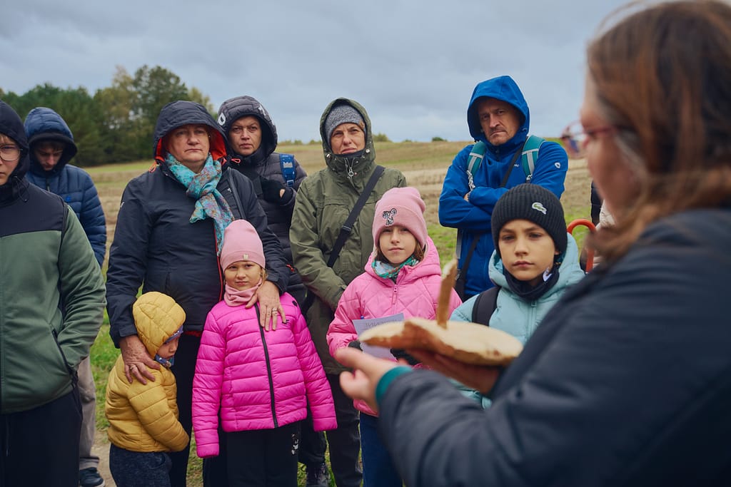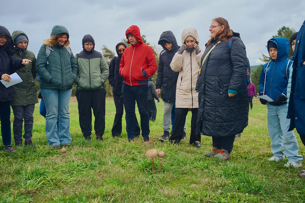 Udało nam się też zaobserwować stadko raniuszków. Pod drzewami, na których usiadły raniuszki, spotkaliśmy muchomora czerwonego i opowiedzieliśmy o nim, jego udziale w kulturze oraz wierzeniach na jego temat. Idąc dalej, spotkaliśmy obficie owocujący jałowiec oraz grzyby nadrzewne: hubiaka i łuskwiaka złotawe-go. Na poboczu zauważyliśmy grupkę purchawek oczkowa-tych, a pod kamieniami i korą zaobserwowaliśmy małe krocionogi, mateczniki, prosionki i stonogi. Licznie występowały też kosarze z gatunku kolcuch zębaty.