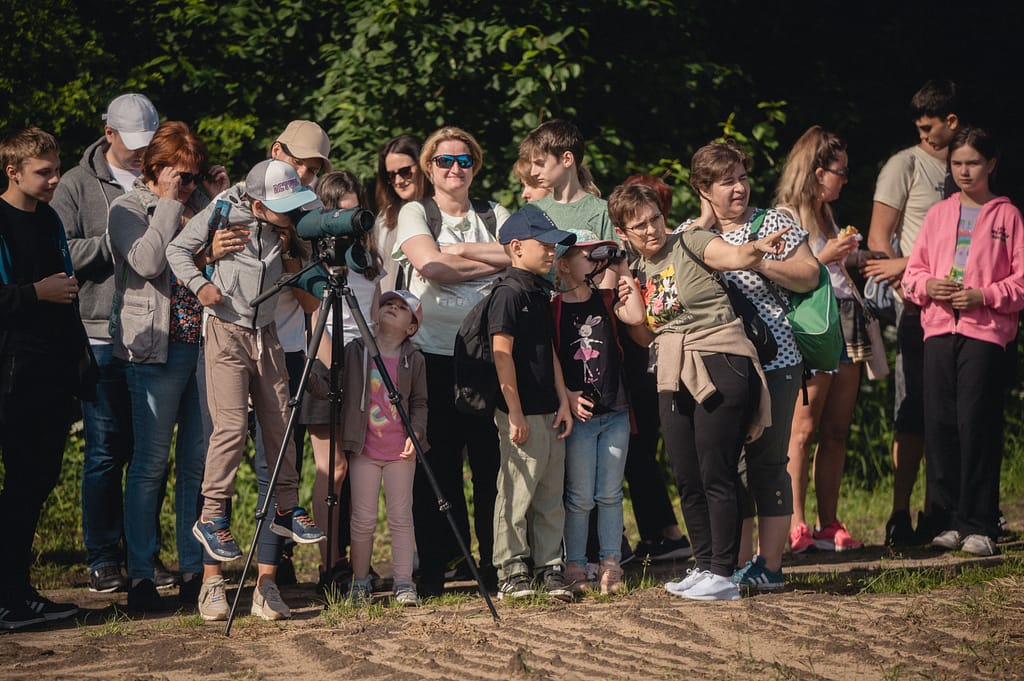 Następnie wyszliśmy na śródpolną drogę prowadzącą nas polami, wśród wąskich pasków zadrzewień. Z bardzo daleka można było dostrzec siedzące na słupach przewodów elektrycznych czarne sylwetki kruków. Pola niemal na całej trasie wypełniał śpiew skowronków polnych. Zupełnie niespodziewanie, w mijanym lasku z cherlawych sosenek, pokazała się pojedyncza sikorka czubatka, ale jej ruchliwość i chowanie się w koronach tylko niektórym pozwoliła dostrzec charakterystyczny „czubek” z piór. Dalej, wśród pól, o kilkaset metrów od nas wylądował pojedynczy żuraw, który zupełnie nie zwracał uwagi na naszą obecność – żerował i spokojnie poprawiał pióra. Nad kępą lasu w oddali majestatycznie krążył myszołów, pokazując swoje duże, szerokie skrzydła uniesione w kształcie delikatnej litery „V”. Nieopodal drogi, na ugorze spostrzegliśmy parę kontrastowo upierzonych pokląskw, z białymi brwiami i pomarańczową piersią, które wdzięcznie pozowały na suchych łodygach nawłoci i każdy mógł nasycić się ich widokiem patrząc przez lunetę.
